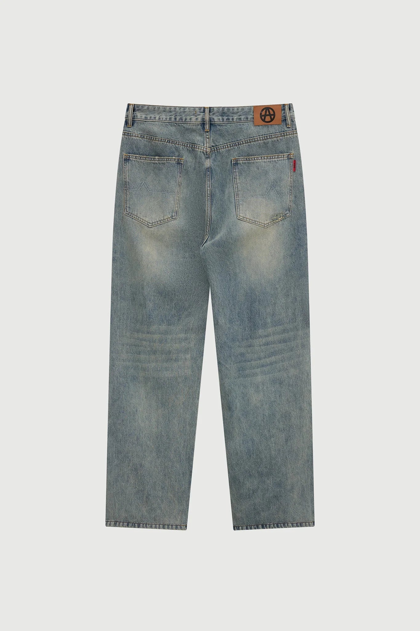 Denim lavato da motociclista con sbiadimento ad alto contrasto e profondità testurizzata, tagliato in una vestibilità rilassata.