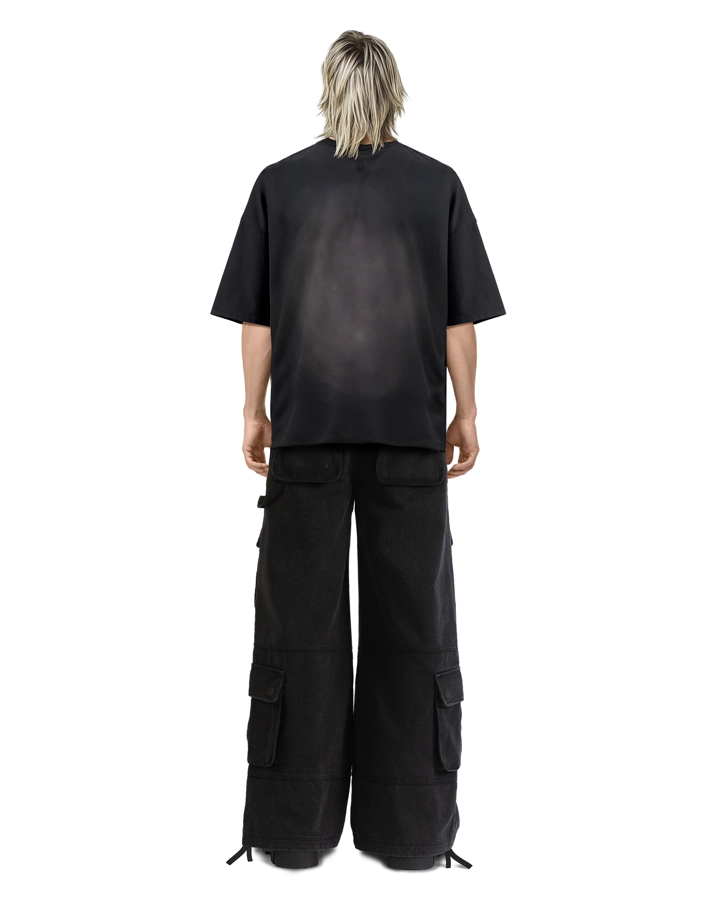 La Butterfly Black T-Shirt è una maglietta di cotone oversize che fonde streetwear di alta moda con un tocco di arte. È dotato di una grafica digitale dettagliata ispirata alle farfalle stampata audacemente sul davanti, che si distingue dal tessuto nero. Le maniche corte, il colletto e l'orlo della maglietta sono rifiniti con bordi "lividi" grezzi e uno speciale lavaggio consumato conferisce al materiale un effetto vintage leggermente consumato. Taglio con spalle scendono per un look rilassato, include anche un piccolo logo ricamato sul retro. Questa maglietta offre un mix di comfort e stile creativo, rendendola un pezzo eccezionale per qualsiasi ensemble casual.