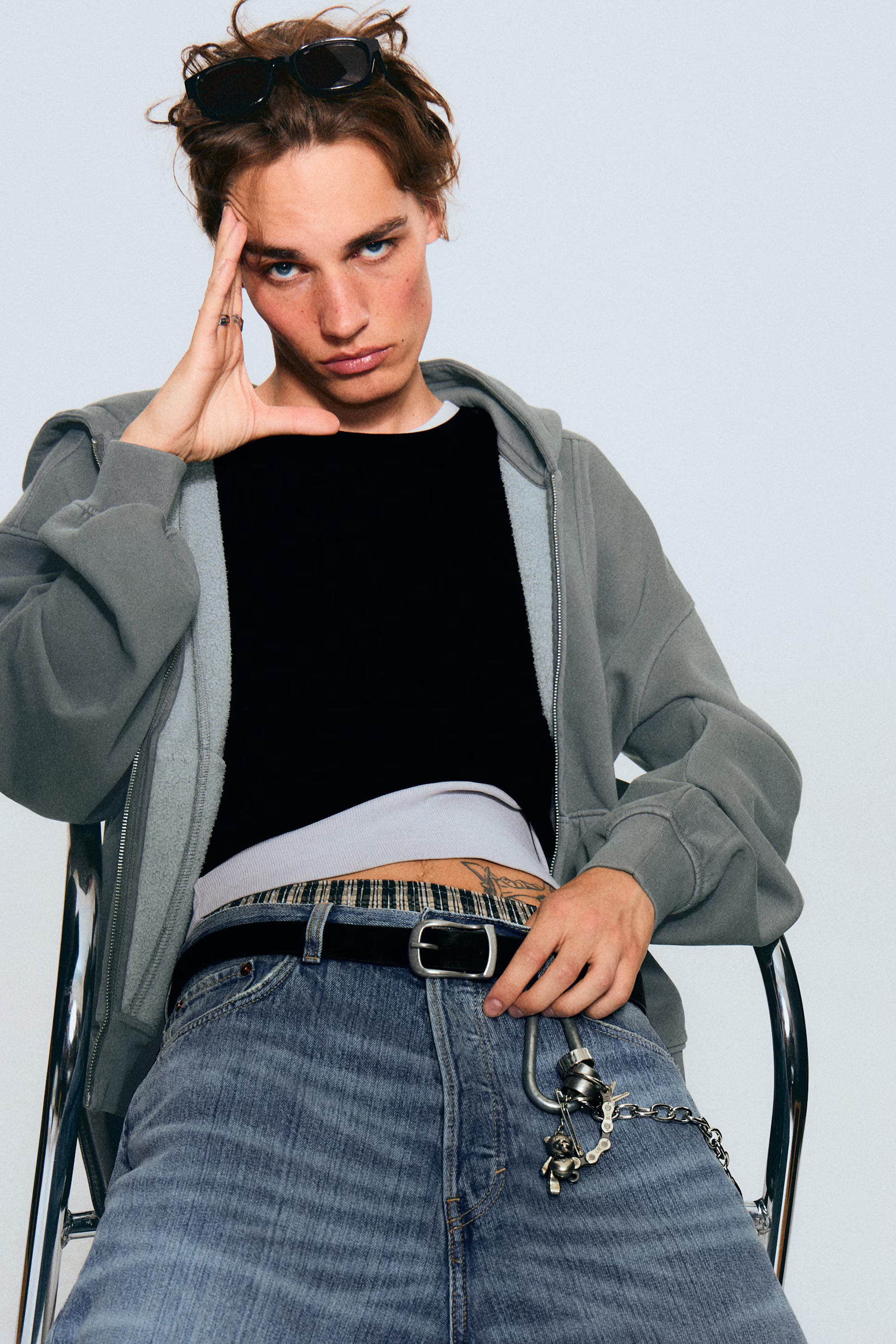 Una felpa con cappuccio con zip ampia e dettagli a pannello curvo. Realizzato in pile di cotone pesante, presenta un cappuccio a doppio strato, una cerniera in metallo nascosta al centro davanti e tasche a marsupio con barre rinforzate. Progettato con cuciture arricciate per maniche e orlo per una silhouette morbida e arrotondata.