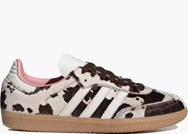 Adidas Samba OG Cow Print (W) è caratterizzata da una tomaia in pony cow print. Le Three Stripes e le linguette sul tallone in pelle bianca creano un netto contrasto. Dettagli in rosa aggiungono un tocco delicato di colore, mentre i lacci extra consentono di personalizzarne il look. La suola gum completa il design della sneaker.